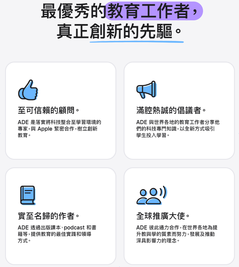 作為一名ADE,我深知這個社群的份量。它不只是一個名銜,更是一群致力於用Apple科技顛覆教學、改變世界的先鋒。如果你正透過iPad和Mac讓學生成為課堂主角,如果你渴望成長、渴望證明自我,那麼,請即刻準備:ADE的機會正向你招手。
