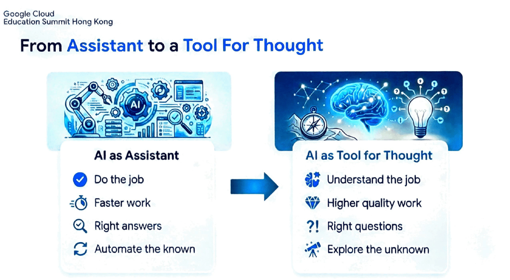 昨天出席了 Google Cloud Education Summit Hong Kong 2026。這場峰會不僅是技術的展示,更是一場關於教育範式轉移的思辨。最深刻的體會是:AI 已不再單純是協助工作的「助手」(Assistant),而是啟發思考的「工具」(Tool for Thought)。