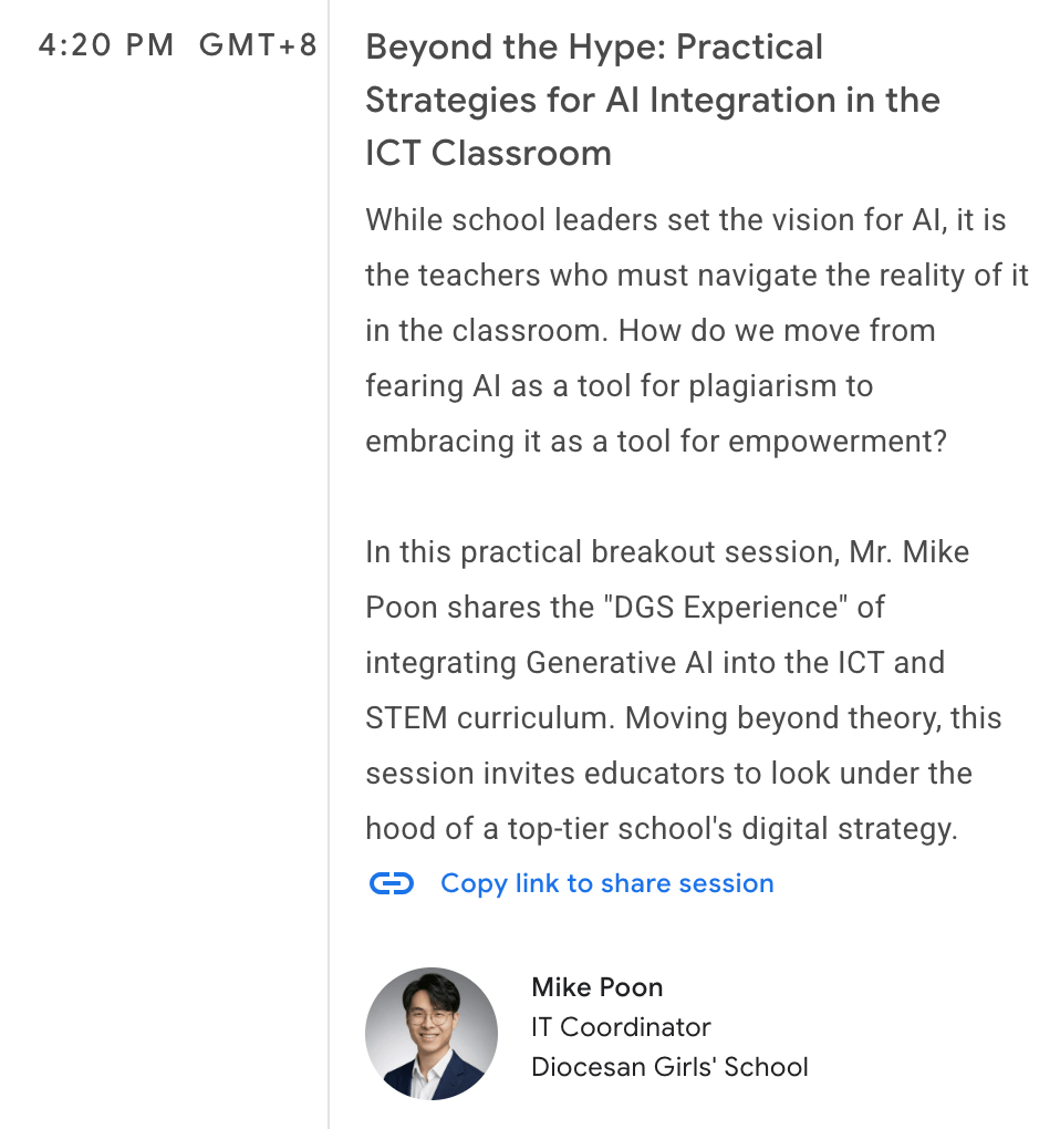 這是繼參加 Google AI+EDU Fellowship 之後,我第二次參加於 Google AI 相關的教育活動。這次峰會讓我更堅信,AI 在中文科的推廣,重點不在於「取代」思考,而是在於「拓寬」與「深化」。當學生能運用 AI 突破寫作瓶頸,教師就能騰出更多空間,與學生進行更深層次的靈魂對話與文學賞析。