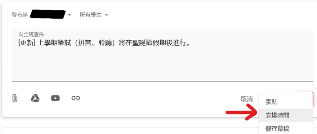 可是,老師有時候真的只有晚上才有時間處理這些瑣碎事務,怎麼辦?我建議在晚上發廣播短訊的老師們善用「安排時間」(Scheduled)功能,避免短訊馬上發出,並且可以讓短訊在「收視率」高的時段裡傳達。
